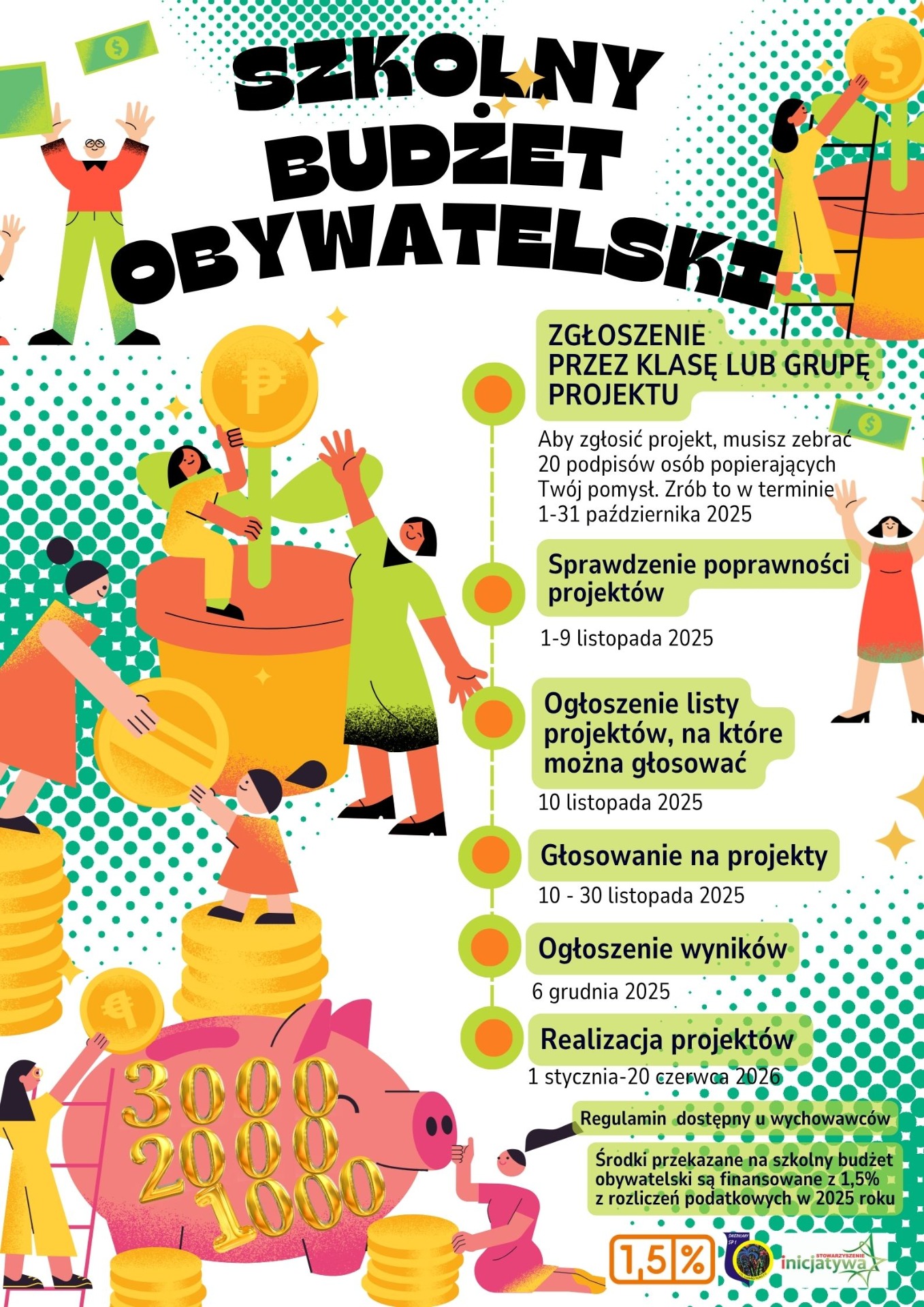 Środki przeznaczone na szkolny budżet obywatelski są finansowane z 1,5% rozliczeń podatkowych w 2025r., które zostały przekazane Stowarzyszeniu Przyjaciół Szkoły Podstawowej nr 1 im. Ludwika Holesza w Świerklanach "Inicjatywa"